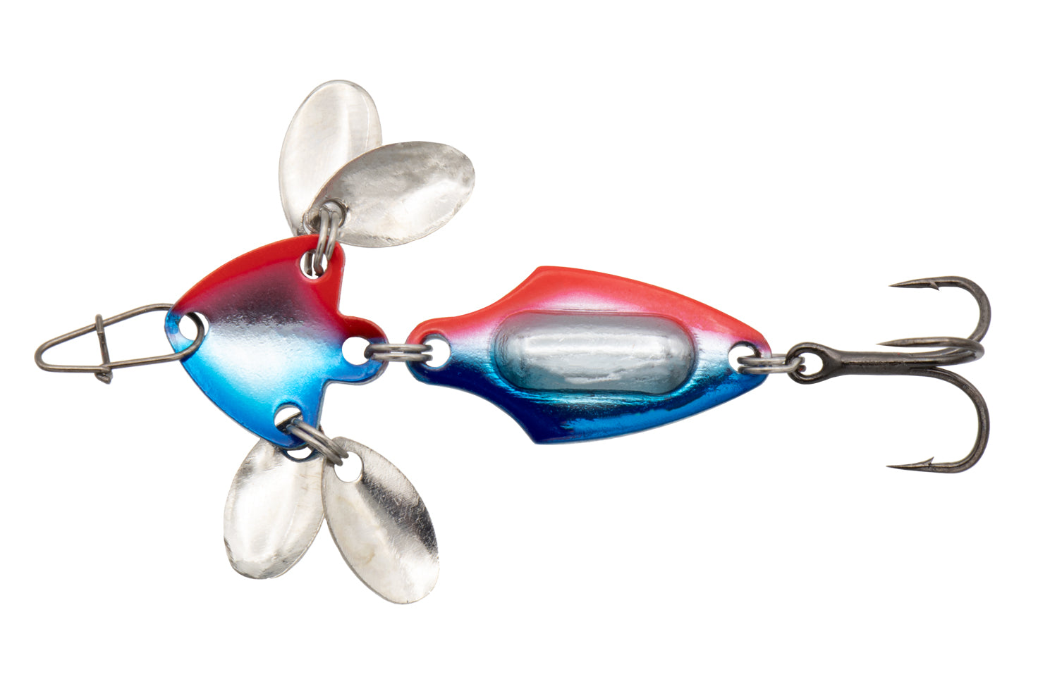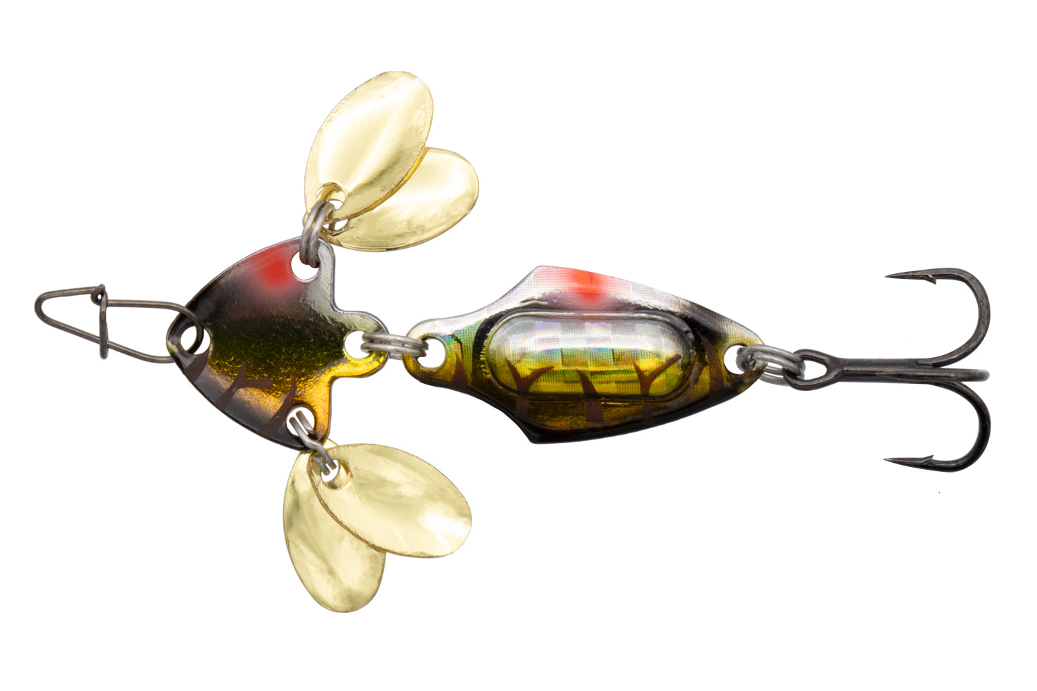On top of being a flutter spoon, rattle spoon and bladed spoon, this new Spade Blade version is jointed which gives it unique movements in the water. While jigging up the joint generates an undulating raise and once falling down a unique twisting flutter action will activates.